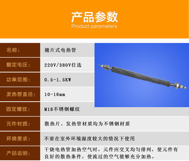 翅片電加熱管適用于烘箱、烘道加熱,一般加熱介質(zhì)為空氣。