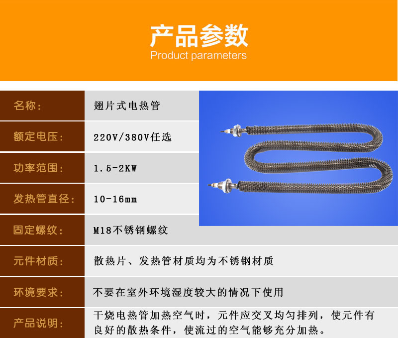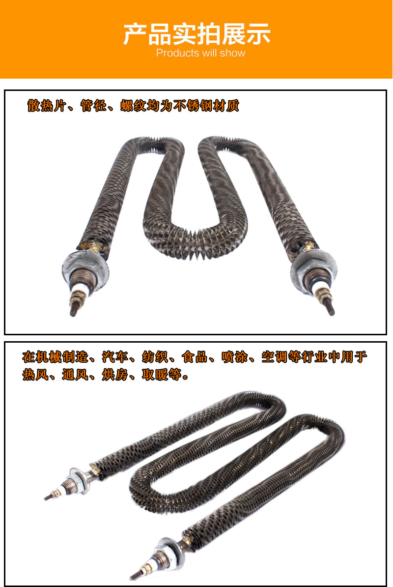 翅片電加熱管適用于烘箱、烘道加熱,一般加熱介質(zhì)為空氣。
