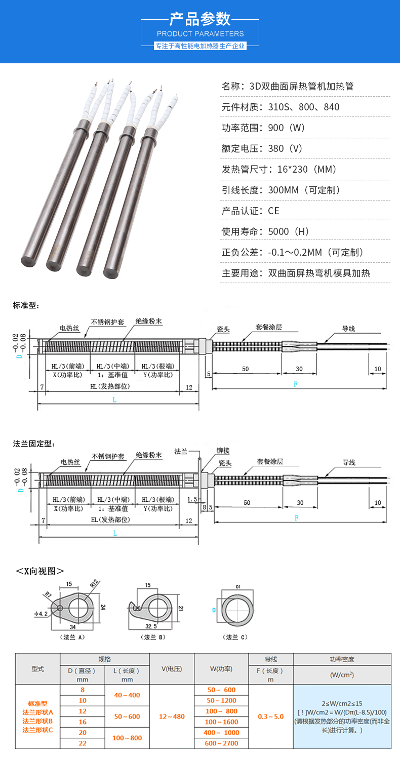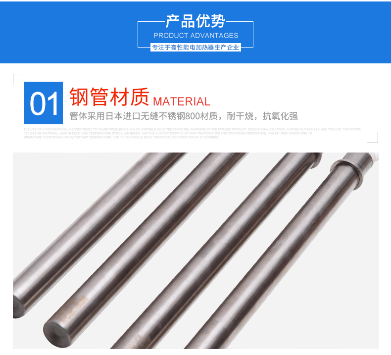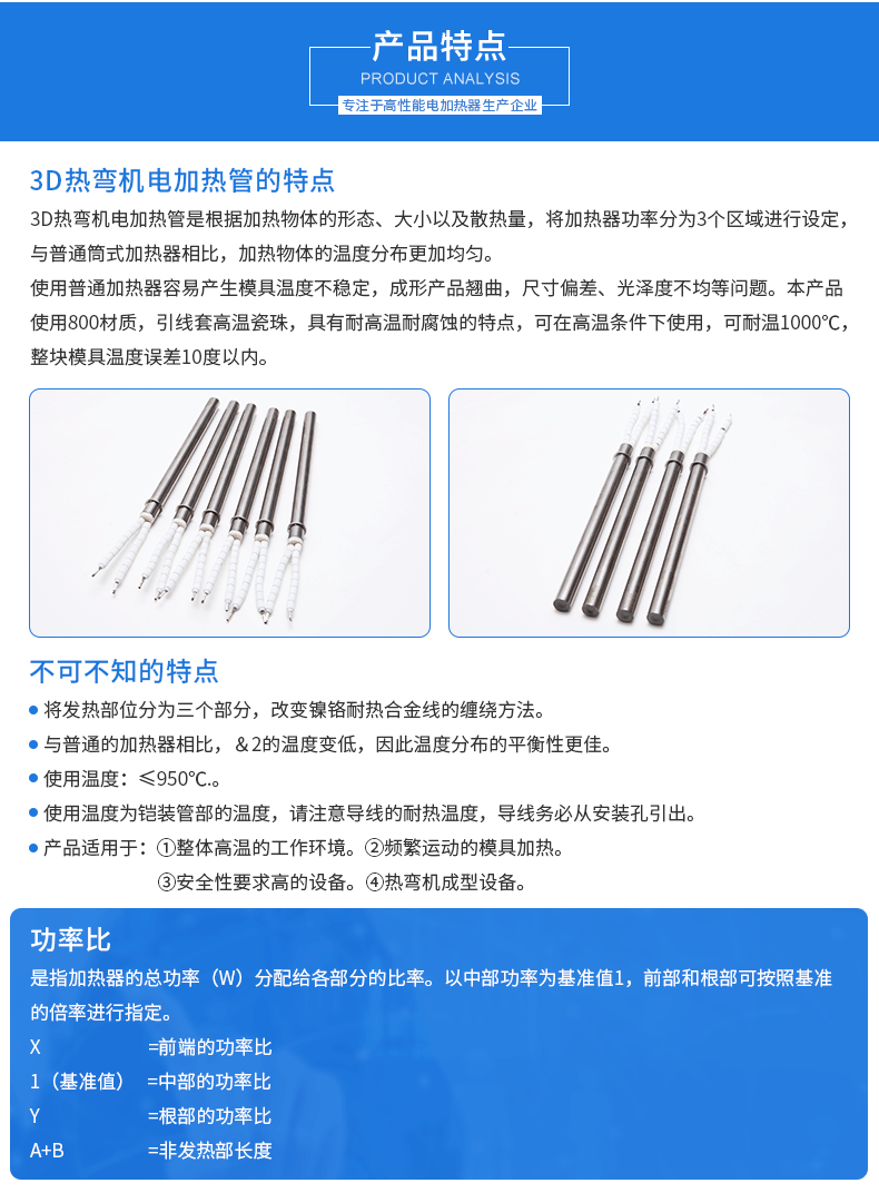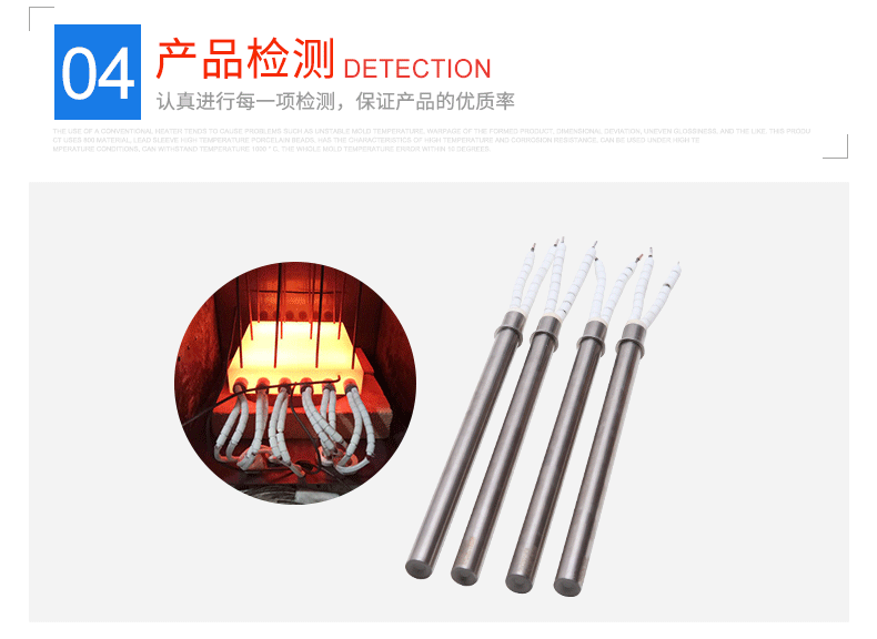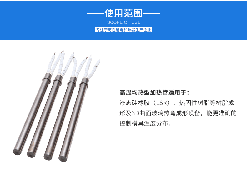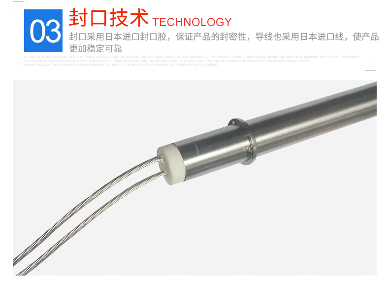 熱彎機成型模具電加熱棒是根據客戶的高溫要求來設計生產的。客戶由于要求高溫條件下使用單頭電熱管,而在高溫條件下,單頭電熱管的高溫管會出現熔化現象,因此用瓷珠來代替高溫管,可以防止熔化,增長使用壽命。深圳新宏大電熱科技有限公司根據20多年生產單頭加熱棒的經驗和技術,專注研發(fā)生產優(yōu)質高端熱彎機模具用耐高溫單頭電加熱棒,并提供熱彎機溫度均勻技術解決方案。
