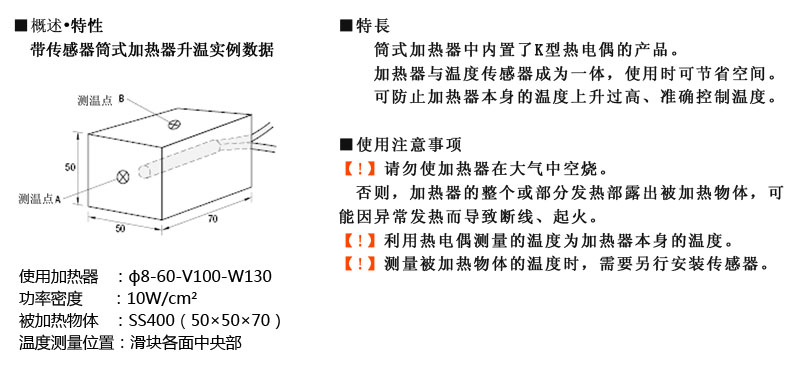 產(chǎn)品特點:帶傳感器型單頭電加熱管是內(nèi)置了K型熱電偶的產(chǎn)品,加熱器與溫度傳感器融為一體,使用時節(jié)省了空間,還可防止加熱器本身溫度上升過高,準確控制溫度。