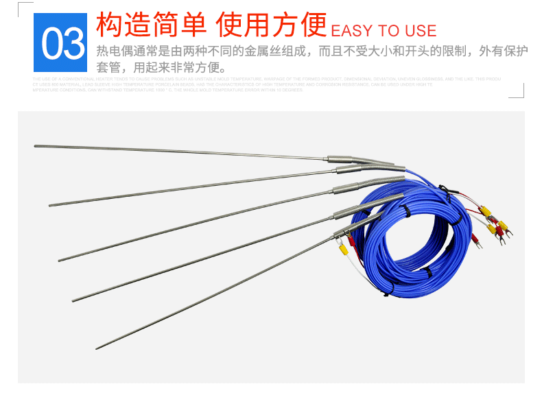③ 構(gòu)造簡單,使用方便 熱電偶通常是由兩種不同的金屬絲組成,而且不受大小和開頭的限制,外有保護套管,用起來非常方便。