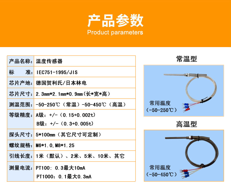 熱電阻外殼為不銹鋼304和316L,默認尺寸是直徑4mm*長度30mm(如要其他尺寸可咨詢客服),測溫范圍-50-200℃(另有特殊溫度范圍可選-200-200℃,或者是-50-500℃)引線是三線制雙包鐵氟龍鍍銀屏蔽線(防腐蝕耐油)。