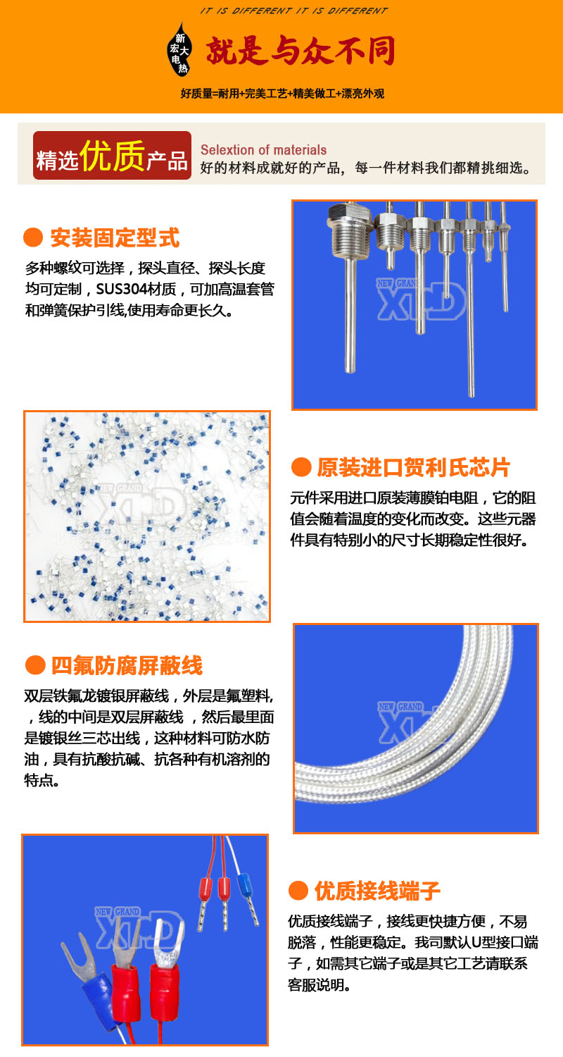 熱電阻導(dǎo)線的外層是氟塑料,防水防油和一般腐蝕可以用,線的中間一層是雙層屏蔽線 ,然后最里面是鍍銀絲,氟塑料原料都是進口美國,絕不使用回收材料。采用這種線制作的熱電阻最大的優(yōu)點就是可以最大限度的防干擾增強信號。