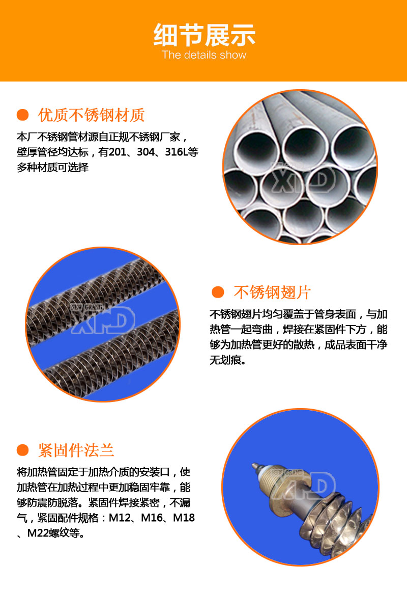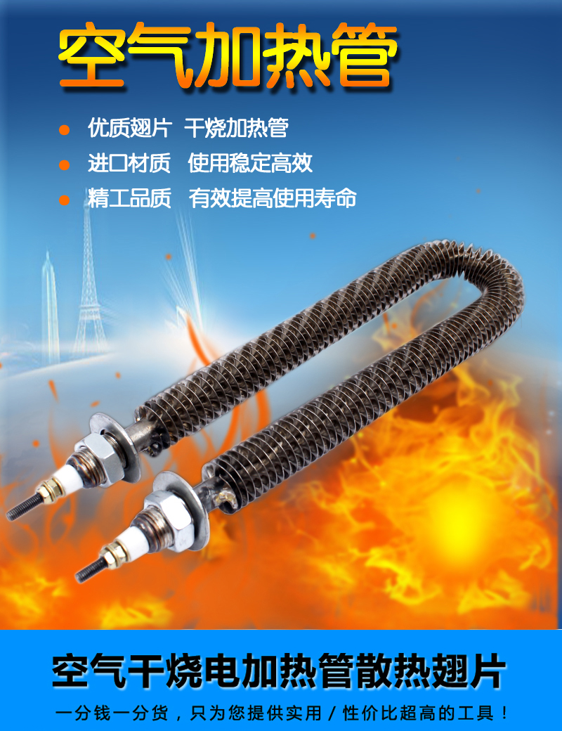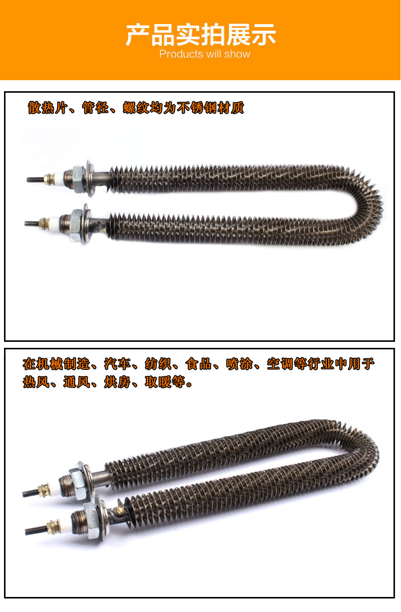 U型翅片加熱管采用優(yōu)質(zhì)不銹鋼、進(jìn)口氧化鏷粉、高電阻電熱合金絲、不銹鋼散熱片等材料,通過先進(jìn)的生產(chǎn)設(shè)備和工藝制作而成,翅片電加熱管可以安裝在吹風(fēng)管道中或其它靜止、流動(dòng)空氣的加熱場(chǎng)合。它與普通加熱管相比,散熱面積擴(kuò)大了2~3倍,即翅片元件所允許的表面功率負(fù)荷是普通元件的3~4倍。由于元件的長(zhǎng)度縮短,使得本身的熱損失減小,在相同的功率條件下,具有升溫快、發(fā)熱均勻、散熱性能好、熱效率高、使用壽命長(zhǎng)、加熱裝置體積小,成本低等優(yōu)點(diǎn)。根據(jù)用戶要求進(jìn)行了合理的設(shè)計(jì),便于安裝。產(chǎn)品在機(jī)械制造、汽車、紡織、食品、家電等行業(yè),尤其在空調(diào)器風(fēng)幕行業(yè)得到廣泛應(yīng)用。